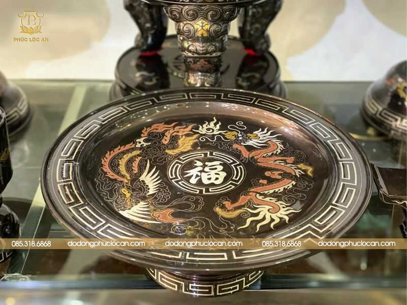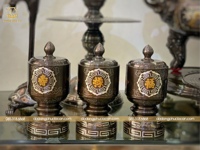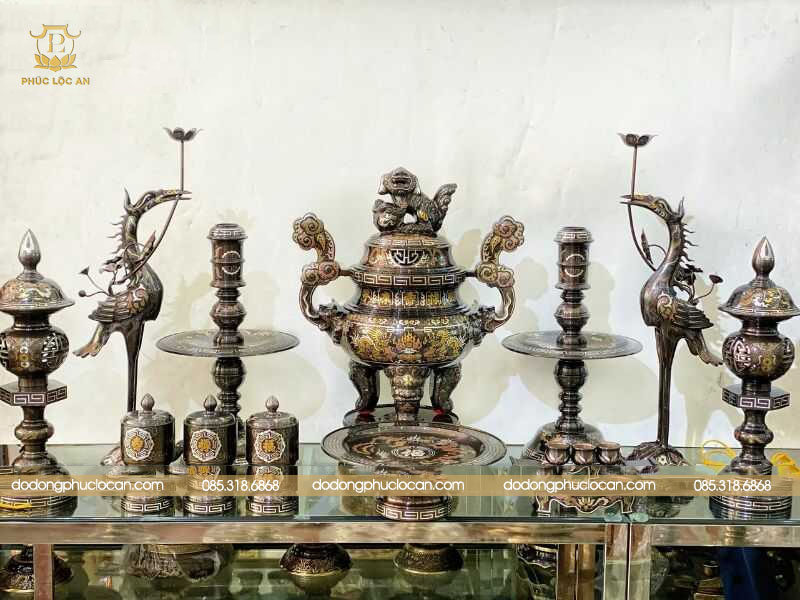 Kèm cùng với bộ sản phẩm là những món đồ gồm có bát hương, lọ hoa, mâm bồng, ống hương, đài thờ, chén nước, đèn thờ,… Tất cả các sản phẩm đều được khảm điểm vàng tại một số hoa văn.