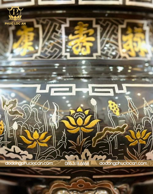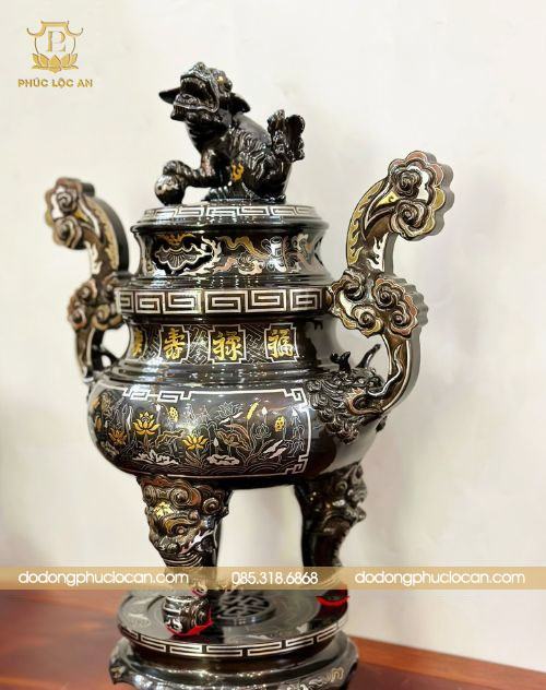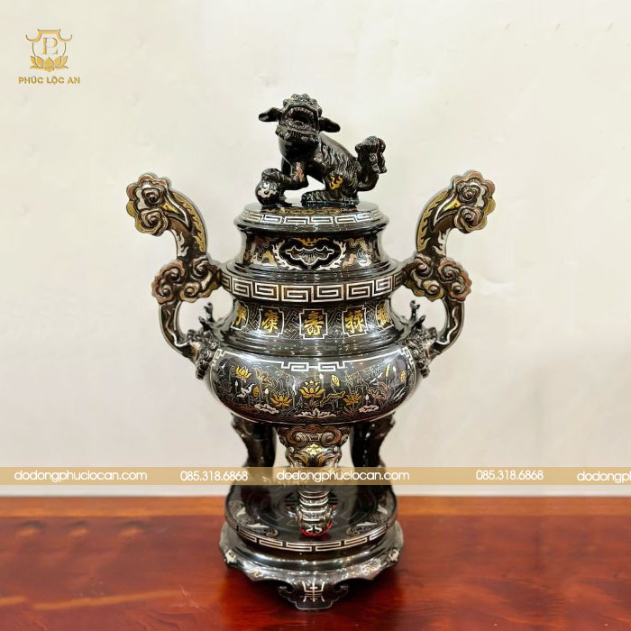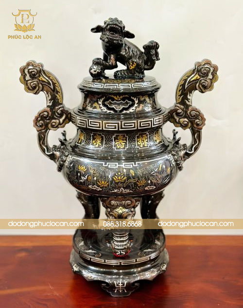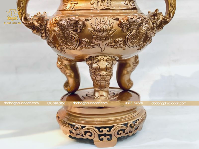 Đỉnh đồng đỏ cao cấp Phúc Lộc An được chế tác thủ công tinh xảo từ đồng đỏ nguyên chất, gồm hai mẫu tiêu biểu: Rồng Chầu Nguyệt 70cm và Khảm Hoa Sen Ngũ Sắc 50cm. Mỗi chi tiết đều thể hiện sự uy nghi và linh thiêng, mang giá trị phong thủy sâu sắc – biểu tượng cho phúc lộc, tài vượng và lòng hiếu kính với tổ tiên.