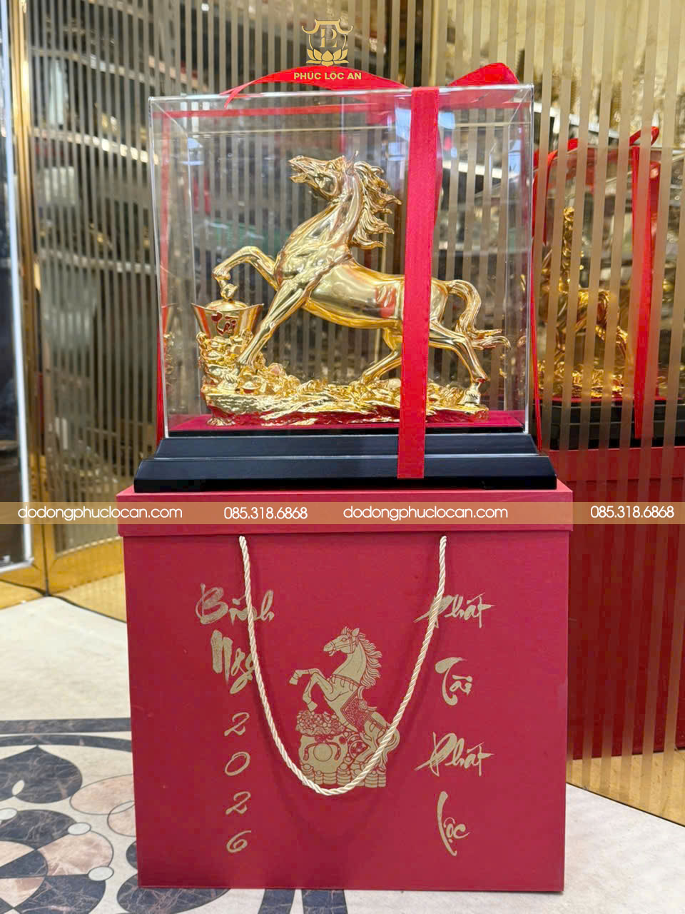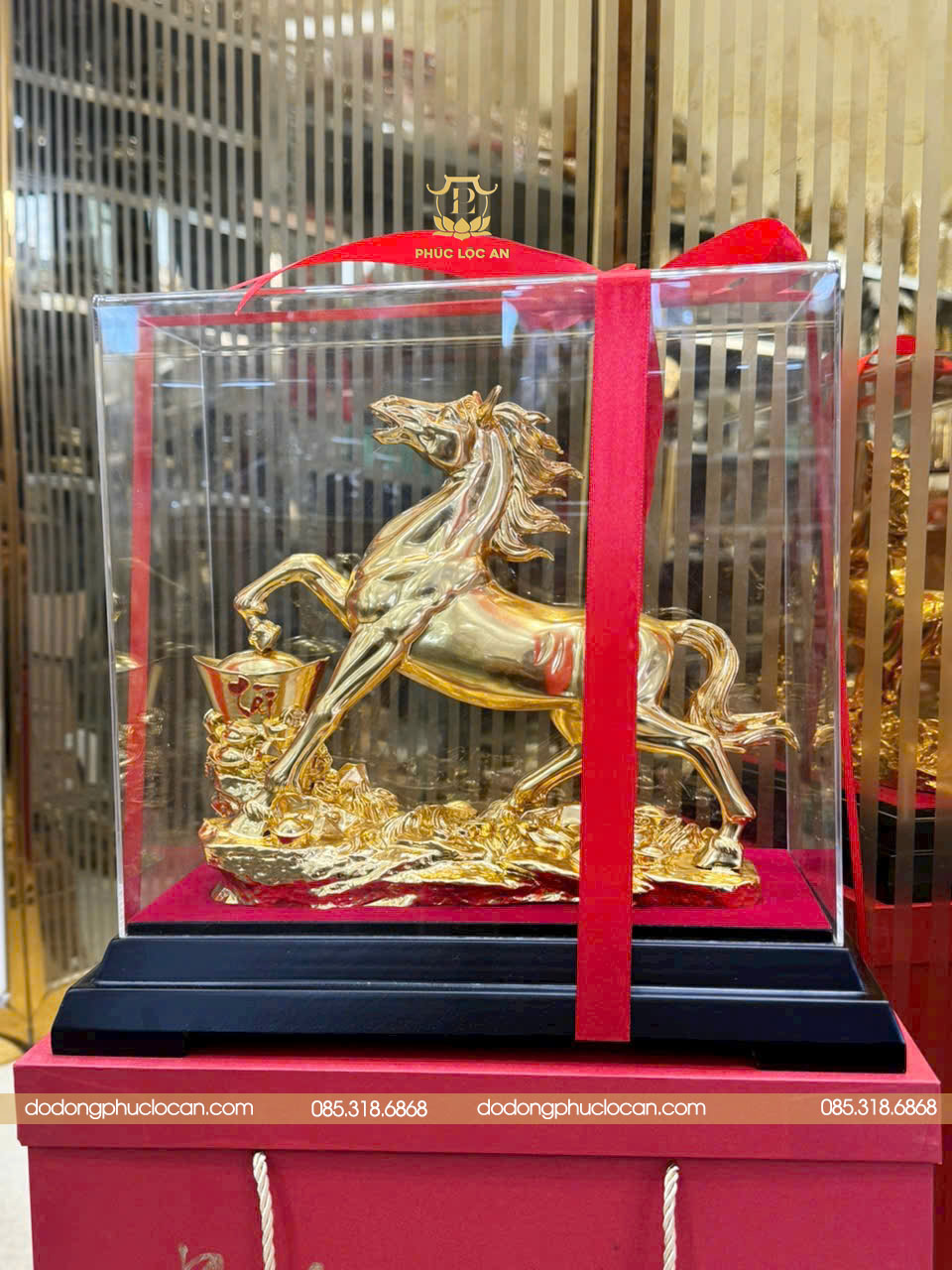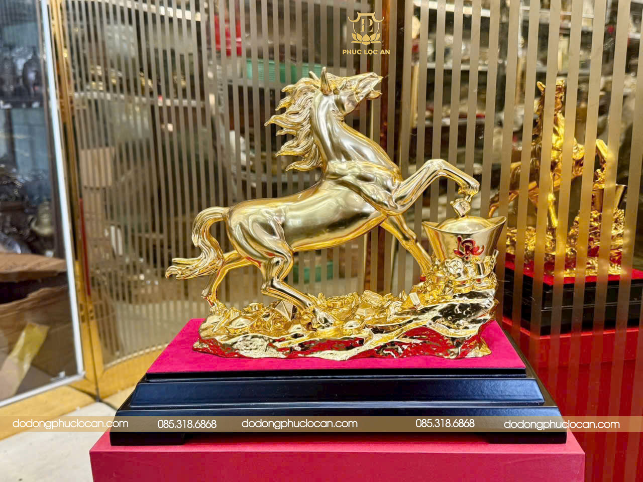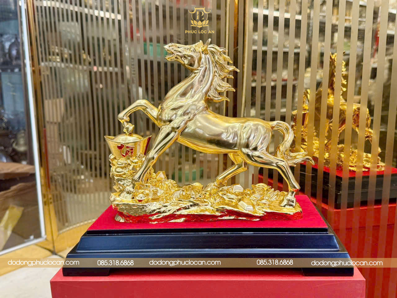 Tượng Ngựa dát vàng Mã Đáo Thành Công mang biểu tượng của sự bứt phá, may mắn và thăng tiến. Sản phẩm được chế tác tinh xảo, bề mặt vàng bóng sang trọng, thích hợp làm quà tặng doanh nghiệp, quà Tết, khai trương, tân gia hoặc trưng bày bàn làm việc để chiêu tài – hút lộc.