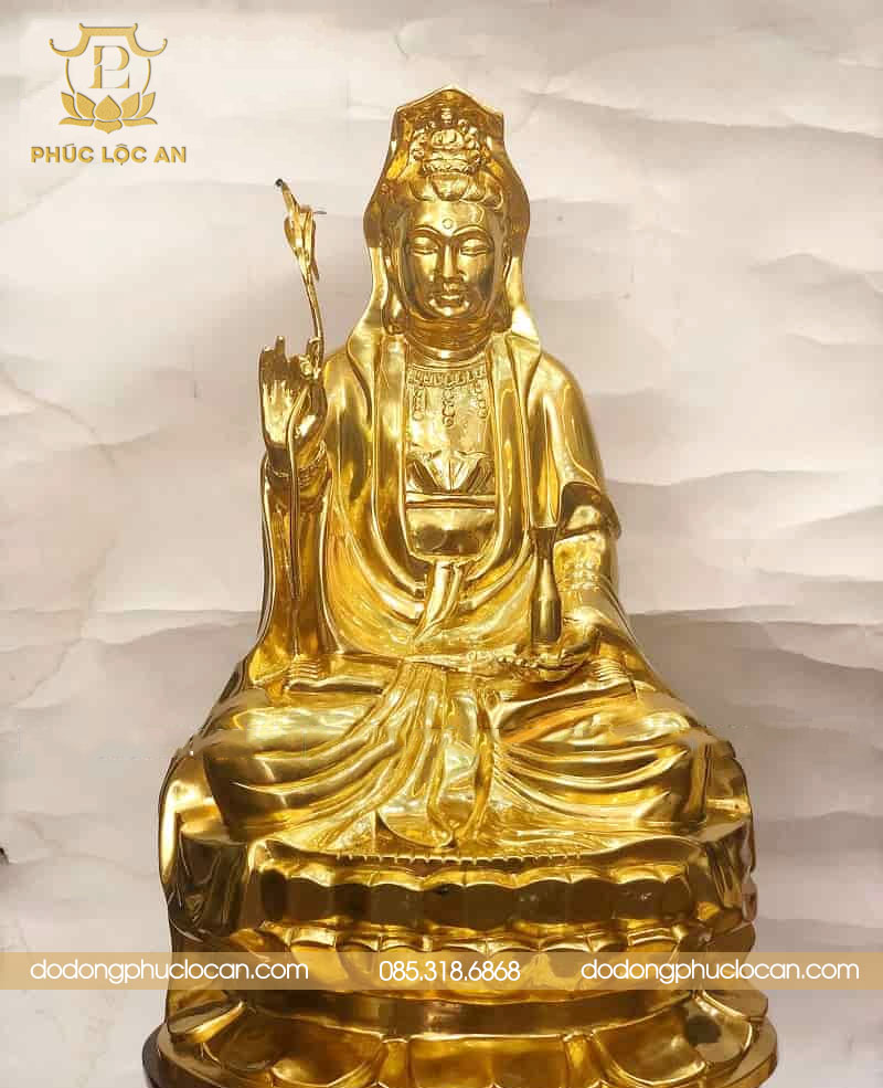Tượng Phật Bà Quan Âm bằng đồng dát vàng cao 80cm là một trong những tác phẩm tiêu biểu thuộc dòng cao cấp được chế tác bởi Phúc Lộc An. Pho tượng thể hiện hình ảnh Đức Quan Thế Âm Bồ Tát với vẻ mặt hiền từ, đôi mắt từ bi, tay cầm bình cam lộ và cành liễu – biểu trưng cho lòng thương xót, cứu khổ cứu nạn và ban phát bình an cho chúng sinh.